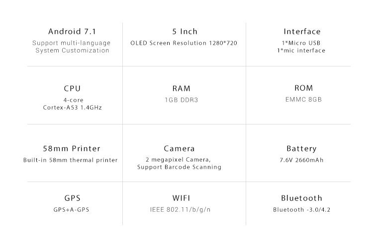 5.0 Inch Android 11 NFC 1D 2D Code Handheld Terminal Printer POS model:H8 4G/3G/GPRS Android 11 5MP camera 5.0inch More