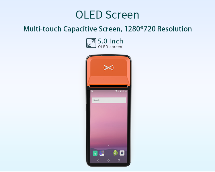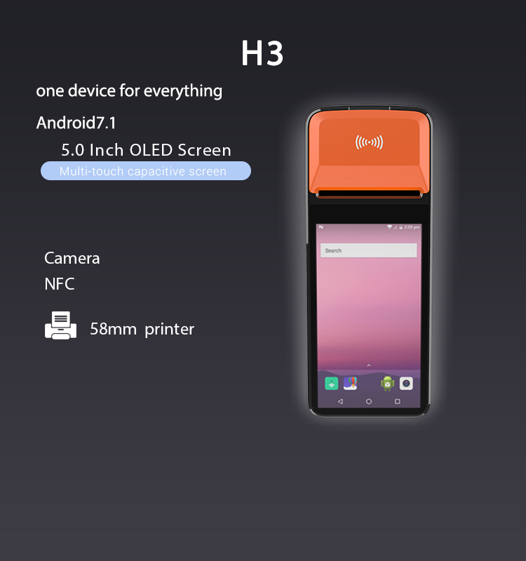 HT518-H3 is a smart handheld pos terminal, it adopts Qualcomm quad-cores processor, Android OS, 5inch touch screen, supports printing, photographing and barcode scanning. Outstanding high performance, high configuration, suitable for mobile payment, mobile sales and other fields.