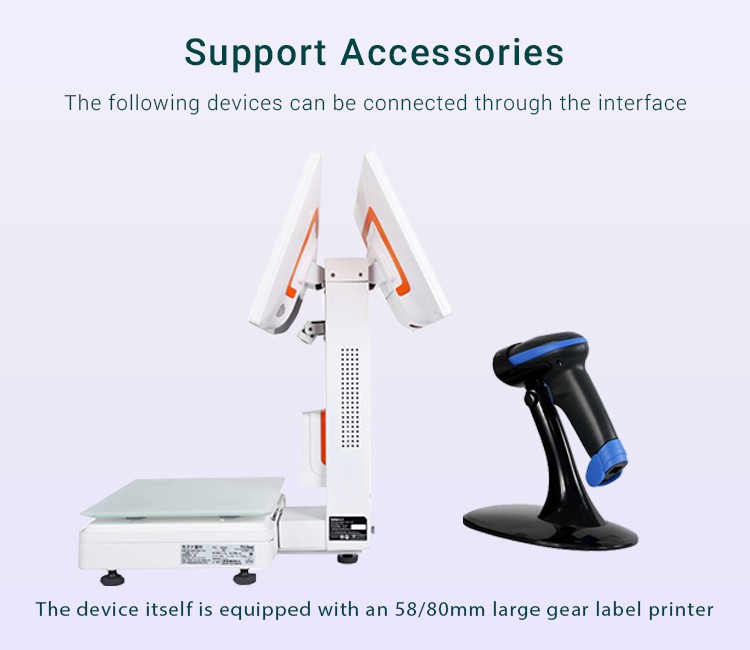 The dual-screen AI cash register all-in-one machine can automatically recognize different items or products to accurately calculate prices and generate transaction receipts. This reduces manual intervention, improving the accuracy of measurement and settlement. Operators need only to place the items on the scale, and the system handles the rest, including price recognition and barcode scanning.